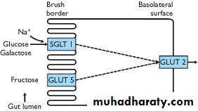 Na-glucose cotransport and Na-galactose cotransport, using a gradient as the energy source on basolateral membrane because the intracellular Na⁺ concentration is low in intestinal cells ,as it in other cells ,Na⁺moves into the cell along gradient. Glucose and galactose are extracted across the basolateral membrane into blood by facilitated diffusion. Fructose is transported across luminal membrane by facilitated diffusion, then extruded into blood.
