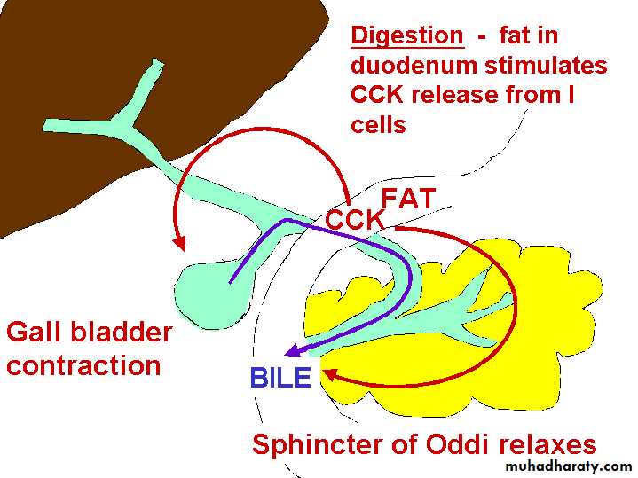 When chyme reaches the small intestine CCK is secreted which stimulates contraction of gallbladder and relaxation of sphincter of Oddi, to flow bile into the lumen of the duodenum. When lipid absorption is complete, bile acids are recirculated to liver.