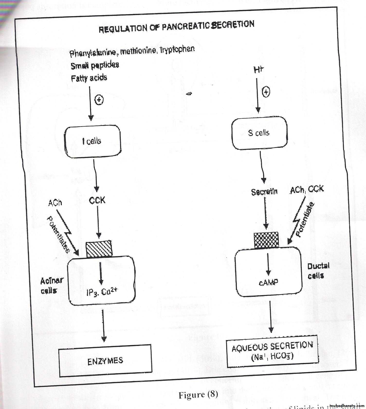 The amino acids, fatty acids are the major stimuli for (CCK) secretion from I cells which found in upper small intestine . CCK( in addition to its effect on the gallbladder, is a potent stimulant of pancreatic enzyme secretion ,by its effect on the acinar cells which trigger the second messenger inisitol tri phosphate(IP3) and then cells makes the enzymes. H⁺ or acid chyme from the stomach with (Low pH<4.5) stimulates release of Secretin From S cells that found in upper small intestine, secretin triggers cAMP in the ductal cells to stimulates large quantities of pancreatic juice containing HCO3.