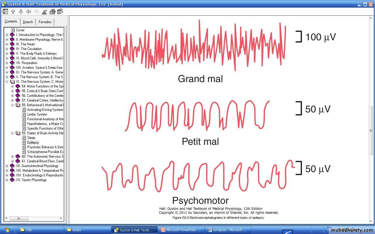 1. Grand mal epilepsy: there is extreme neuronal discharge in all areas of brain (cortex, thalamus, brainstem, spinal cord) leading to tonic-clonic seizures, biting the tongue, difficulty in breathing, urination and defecation, then the person remains in stupor for a few minutes, then fatigued and sleeps for several hours.