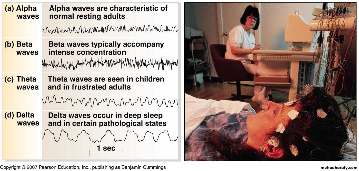 • Theta Waves: frequency from 4-7 /sec. occur mainly in parietal and temporal regions in children, can be recorded in some adults during emotional stress (disappointment and frustration). It also occurs in many brain disorders (degenerative brain disease).