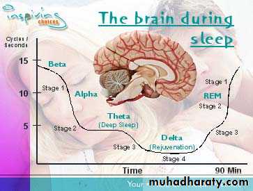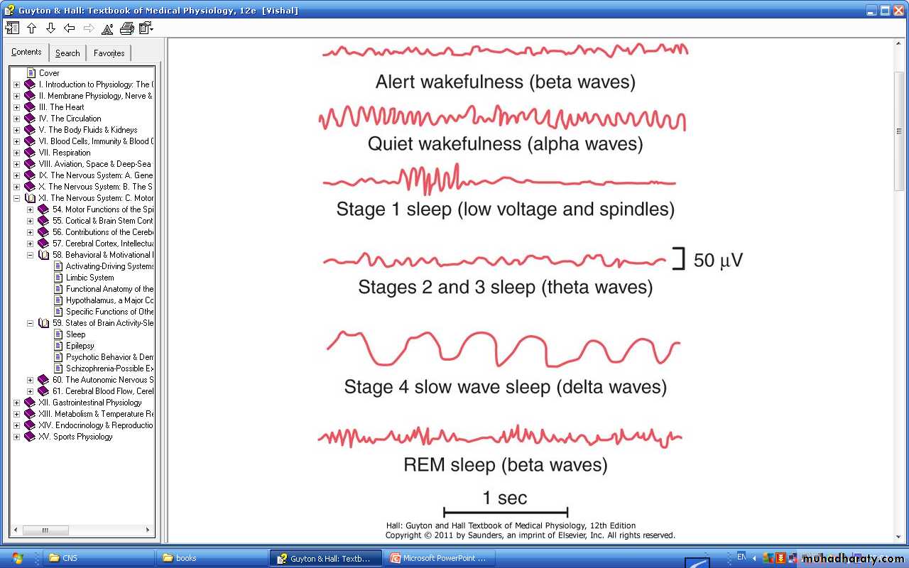 • REM Sleep: occur periodically, not so restful type of sleep. It occupies 20% of sleep time of young adults, lasts 5-30 minutes for every 90 minutes of slow wave sleep, it is associated with active dreaming that can be remembered in awakefulness, associated with decrease in all muscle tone except rapid movements of the eyes, heart rate and respiratory rate are irregular, it is difficult to arouse the person by sensory stimuli, however, people usually awaken in the morning during an episode of REM. In REM sleep the brain is active and the brain metabolism is increased, however, the brain activity is not channeled to let the person fully aware of his surrounding or to be awake.