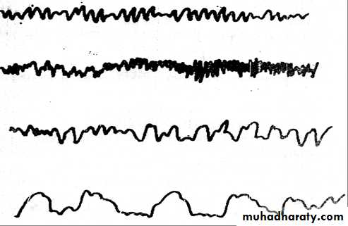 • 1.Alpha Waves: rhythmical waves of 8-13 /sec, frequency from an EEG of almost all normal adult people when they are awake in a quite, resting state of cerebration and closed eyes. When eyes are opened alpha waves change to beta waves. The voltage of alpha waves equals to 50 micro-volts and are easily recorded from occipital lobe, but also can be recorded from frontal and parietal regions of scalp.• Beta Waves: frequency from 14-25 /sec. It might reach to 80 /sec. Always recorded from parietal and frontal regions during activation or tension of CNS.