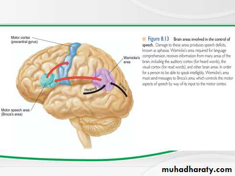 2. Reading & Speaking: The reception is in the primary Visual Area in the occipital lobe, which is connected to the angular gyrus for interpretation, then to the Wernicke area in order to reach a full level of recognition then it goes to the Broca’s Area and then to the motor cortex.