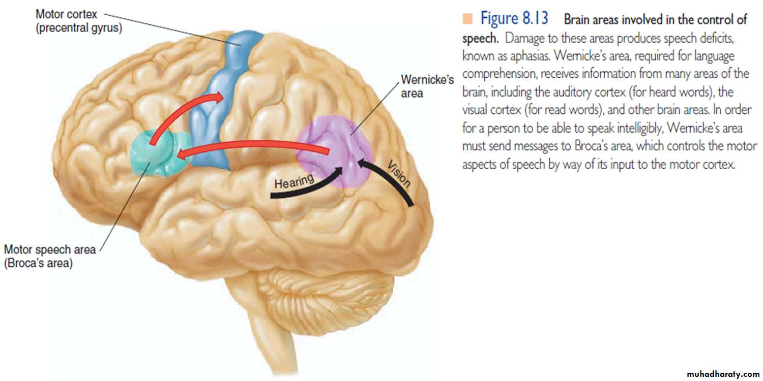 1. Hearing & Speaking: The reception is in the primary Auditory Area (in the temporal lobe) of sound signals, then interpretation of words and determination of thoughts and words to be spoken in the Wernicke Area. Signals are transmitted from the Wernicke area to the Brocas area in order to activate skilled motor programs for control of word formation, and then signals are transmitted to the motor cortex to control the speech muscles.