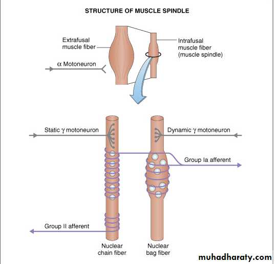 1- Extrafusal fibers constitute the majority of skeletal muscle, are innervated by α motoneurons, and are used to generate force.2- Intrafusal fibers are specialized fibers that are innervated by γ motoneurons and are too small to generate significant force. Intrafusal fibers are encapsulated in sheaths, forming muscle spindles that run parallel to the extrafusal fibers.