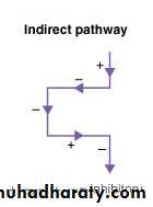 1. Indirect pathway. In the indirect pathway, the striatum has inhibitory input to the external segment of the globus pallidus, which has inhibitory input to the subthalamic nuclei. The subthalamic nuclei project excitatory input to the internal segment of the globus pallidus and the pars reticulata of the substantia nigra, which send inhibitory input to the thalamus. The thalamus then sends excitatory input back to the motor cortex. In this pathway, the inhibitory neurotransmitter is GABA, and the excitatory neurotransmitter is glutamate. The overall output of the indirect pathway is inhibitory, as illustrated in the summary diagram at the bottom of the figure