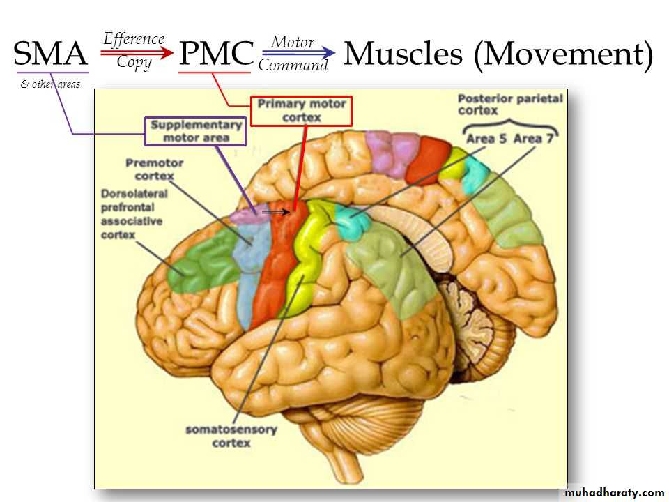 Voluntary movements are directed by the motor cortex, via descending pathways. The motivation and ideas necessary to produce voluntary motor activity are first organized in multiple associative areas of the cerebral cortex and then transmitted to the supplementary motor and premotor cortices for the development of a motor plan. The motor plan will identify the specific muscles that need to contract, how much they need to contract, and in what sequence. The plan then is transmitted to upper motoneurons in the primary motor cortex, which send it through descending pathways to lower motoneurons in the spinal cord. The planning and execution stages of the plan are also influenced by motor control systems in the cerebellum and basal ganglia.1. Premotor cortex and supplementary motor cortex (area 6) are the regions of the motor cortex responsible for generating a plan of movement, which then is transferred to the primary motor cortex for execution.