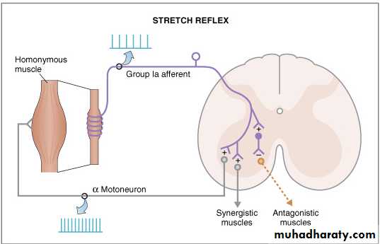 knee-jerk reflex1.When the muscle is stretched, group Ia afferent fibers in the muscle spindle are activated and their firing rate increases. These group Ia afferents enter the spinal cord and synapse directly on and activate α motoneurons ,