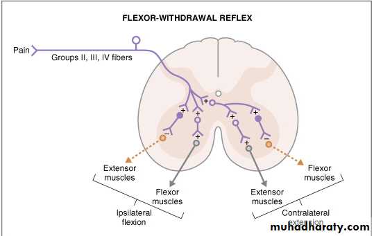 1.When a limb touches a painful stimulus (e.g., hand touches a hot stove), afferent nerve fibers (groups II, III, and IV) are activated. These afferent fibers synapse on multiple interneurons in the spinal cord (polysynaptic reflex).2.On the ipsilateral side of the pain stimulus, reflexes are activated that cause flexor muscles to contract and extensor muscles to relax, giving withdrawal of the hand from the painful stimulus.