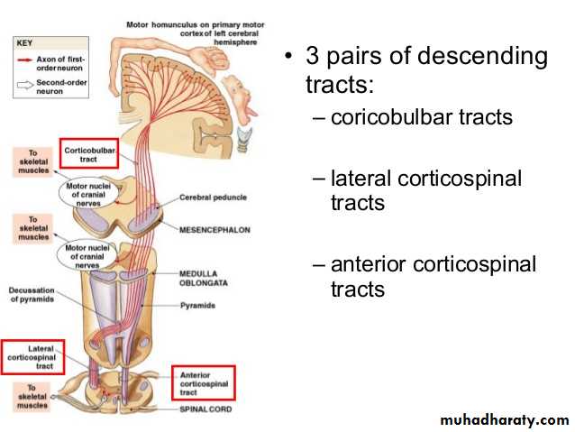 2. The corticospinal tracts; which originates in the cerebral cortex and terminates on the motor neurons of the spinal cord.