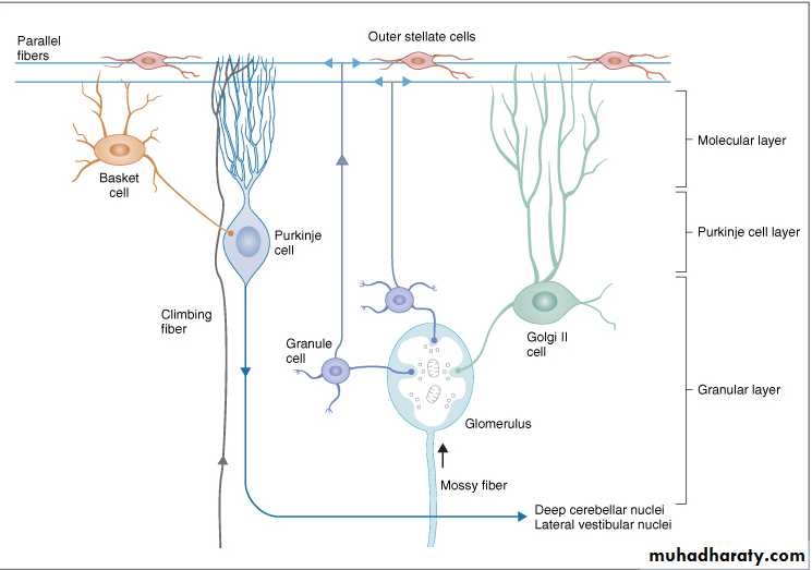 With the exception of granule cells, all of the cerebellar interneurons are inhibitory. Granule cells have excitatory input to basket cells, stellate cells, Golgi II cells, and Purkinje cells. Basket cells and stellate cells inhibit Purkinje cells (via parallel fibers). Golgi II cells inhibit granule cells, thereby reducing their excitatory effect on Purkinje cells.