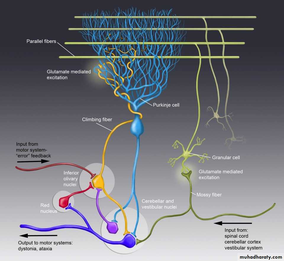 Two systems provide excitatory input to the cerebellar cortex: the climbing fiber system and the mossy fiber system. Each system also sends collateral branches directly to deep cerebellar nuclei, in addition to their projections to the cerebellar cortex. Excitatory projections from the cerebellar cortex then activate secondary circuits, which modulate the output of the cerebellar nuclei via the Purkinje cells.1. Climbing fibers originate in the inferior olive of the medulla and project directly onto Purkinje cells. These fibers make multiple synaptic connections along the dendrites of Purkinje cells, although each Purkinje cell receives input from only one climbing fiber. These synaptic connections are very powerful! A single action potential from a climbing fiber can elicit multiple excitatory bursts, called complex spikes, in the dendrites of the Purkinje cell. It is believed that climbing fibers "condition" the Purkinje cells and modulate their responses to mossy fiber input. Climbing fibers also may play a role in cerebellar learning.