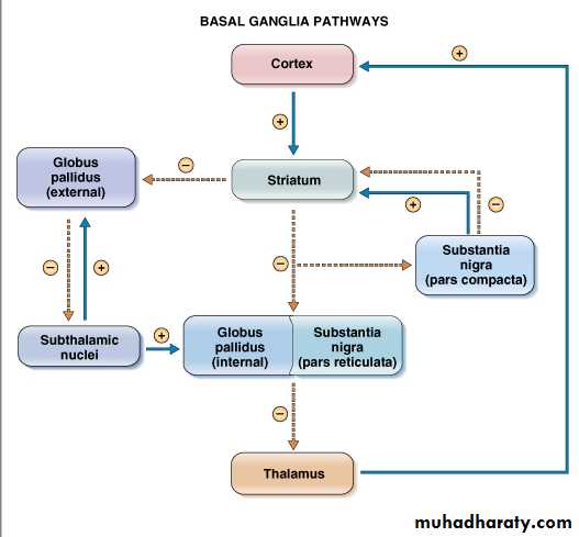Almost all areas of the cerebral cortex project topographically onto the striatum, including a critical input from the motor cortex.The striatum then communicates with the thalamus and then back to the cortex via two different pathways.