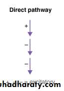 2. Direct pathway. In the direct pathway, the striatum sends inhibitory input to the internal segment of the globus pallidus and the pars reticulata of the substantia nigra, which send inhibitory input to the thalamus. As in the indirect pathway, the thalamus sends excitatory input back to the motor cortex. Again, the inhibitory neurotransmitter is GABA, and the excitatory neurotransmitter is glutamate. The overall output of the direct pathway is excitatory, as shown in the summary diagram at the bottom of the figure.