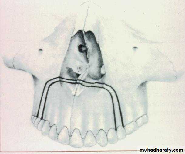 osteotomy linesAnterior view: models showing the upper midline split to widen the intercanine width and the lower anterior set-down.