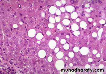 Grossly the liver become yellow and enlarged (some times becomes three times than the normal weight).Microscopically: the extent of fat accumulation varies from minute droplets scattered in the cytoplasm of a few hepatocytes to distention of the entire cytoplasm of most cells by coalesced fat droplets. The hepatocytes become just like adipocyte with distended clear cytoplasm and the nucleus is displaced to the periphery and become flattened