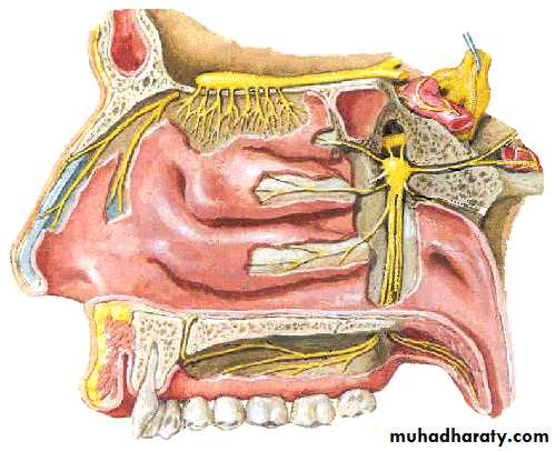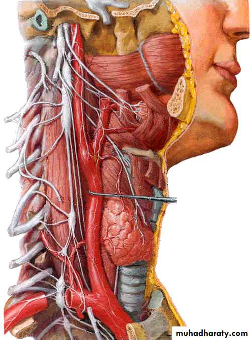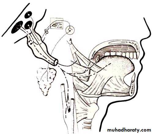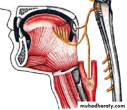 Superior laryngeal nerve: passes down side of pharynx and given rise toInternal branch, which pierces thyrohyoid membrane to innervates mucous membrane of larynx above fissure of glottis