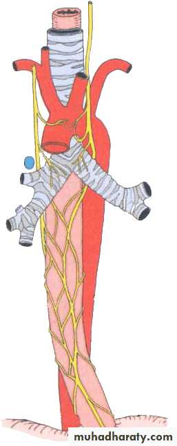 Celiac branches: send branches to celiac plexus to be distributed with sympathetic fibers to liver, pancreas, spleen, kidneys, intestine as far as left colic flexure
