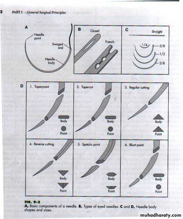 it is varies in gauge or wide ,length and shape such as: round, oval, flat, triangular, straight and curved such as (one fourth1\4used in ophthalmic surgery), (three eight3\8,one half1\2,fifty eight5\8circle and1\2 curve for abdominal surgery).