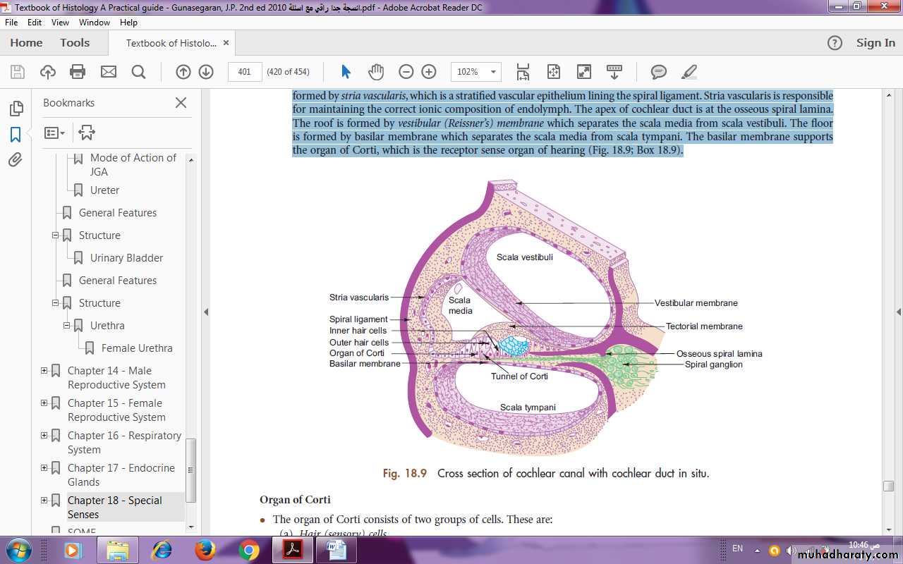 Cochlear duct (scala media) lies within the bony cochlear canal and is triangular in cross section. The base (outer wall) is formed by stria vascularis, which is a stratifi ed vascular epithelium lining the spiral ligament. Stria vascularis is responsible for maintaining the correct ionic composition of endolymph. The apex of cochlear duct is at the osseous spiral lamina.The roof is formed by vestibular (Reissner’s) membrane which separates the scala media from scala vestibuli. The fl oor is formed by basilar membrane which separates the scala media from scala tympani. The basilar membrane supports the organ of Corti, which is the receptor sense organ of hearing (Fig.).