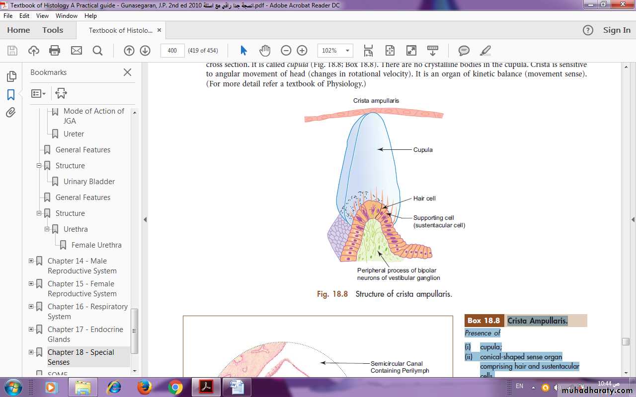 Crista ampullaris is similar in structure to macula, but the glycoprotein layer is very thick and conical in shape in cross section. It is called cupula (Fig.). There are no crystalline bodies in the cupula. Crista is sensitive to angular movement of head (changes in rotational velocity). It is an organ of kinetic balance (movement sense).