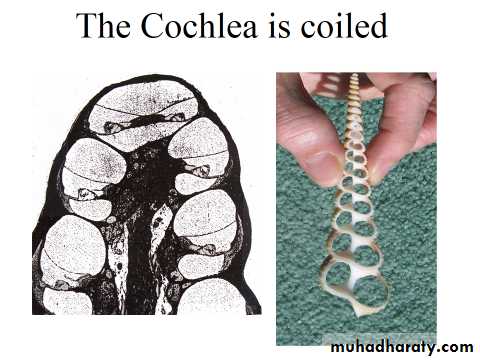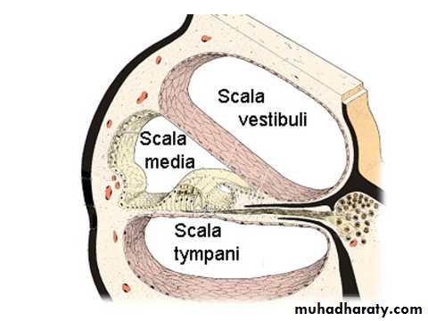 • In cross section, cochlea shows three compartments, the scala vestibuli above, the scala tympani below (these belong to the canal), and scala media in the middle (this belongs to the duct).