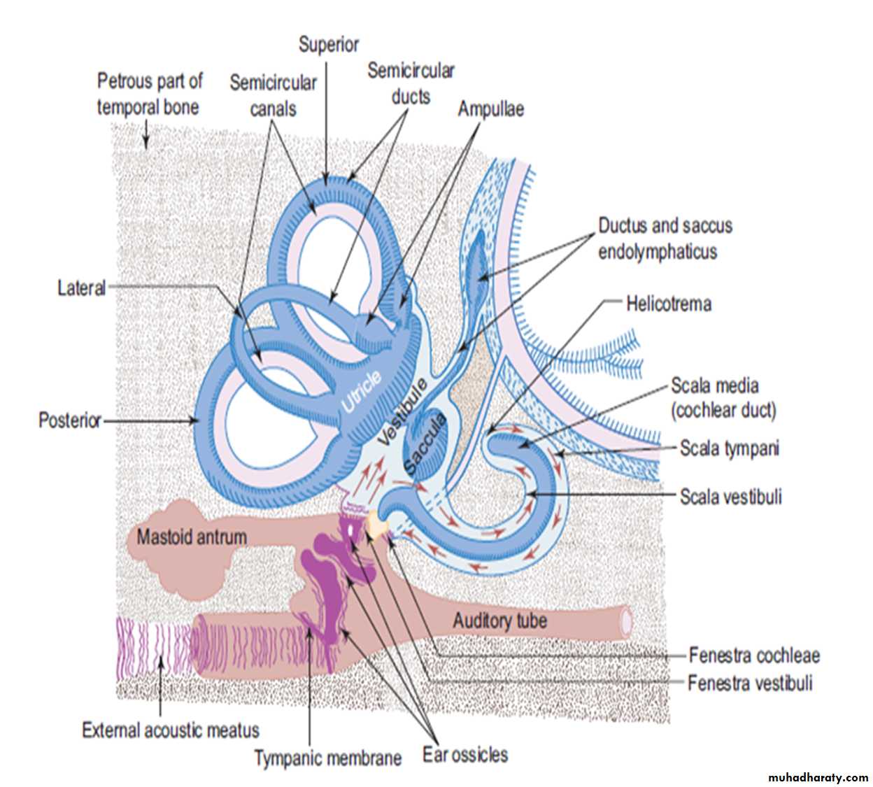 : schematic diagram of ear , red arrows indicate the direction of vibration of perilymph