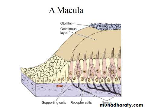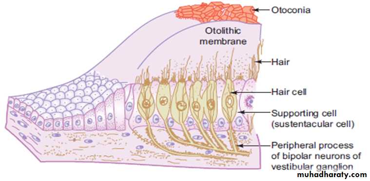 • The stereocilia and kinocilia are embedded in a thick gelatinous plaque of glycoprotein called otolithic membrane, secreted by sustentacular cells.