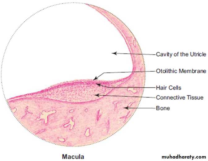 • It contains numerous crystalline bodies called otoliths or otoconia (Fig.). Maculae are sensitive to orientation of the head in relation to gravity or other acceleration forces. It is an organ of static balance or position sense.