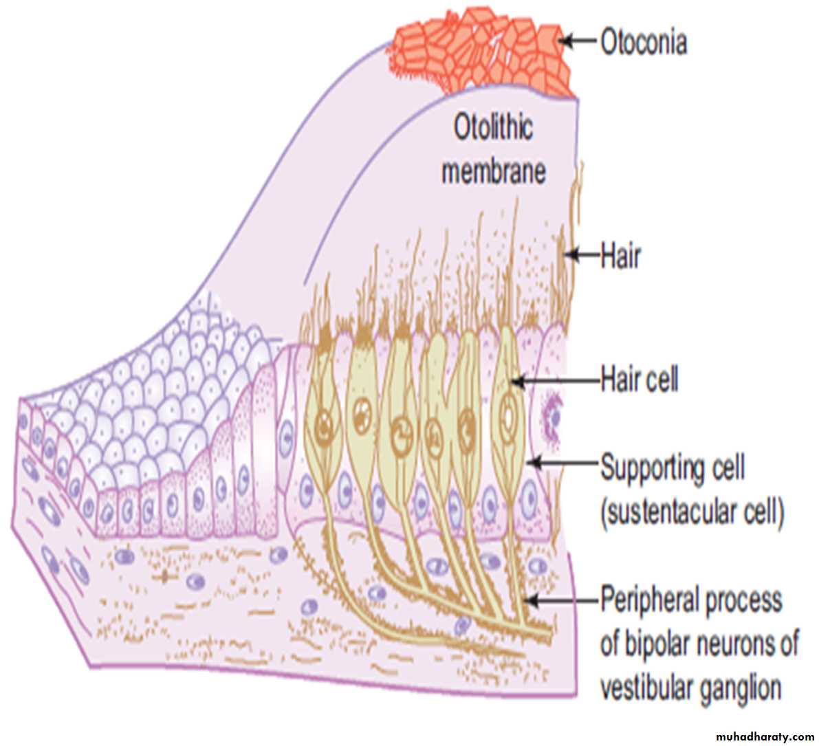 The sustentacular cells are columnar supporting cells with microvilli on their free surface. Hair cells are fl ask shaped sensory cells lying between sustentacular cells. Hair cells are innervated by vestibular part of the vestibulocochlear nerve.