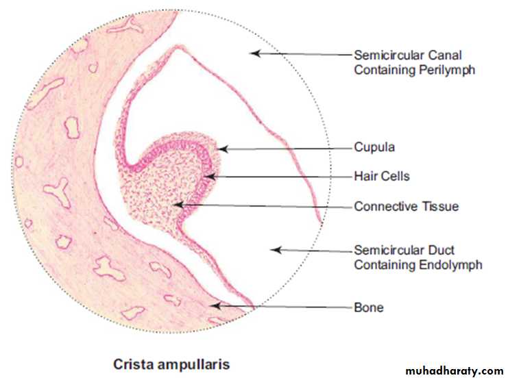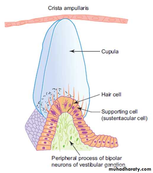 • Crista ampullaris is similar in structure to macula, but the glycoprotein layer is very thick and conical in shape in cross section. It is called cupula (Fig.). There are no crystalline bodies in the cupula. Crista is sensitive to angular movement of head (changes in rotational velocity). It is an organ of kinetic balance (movement sense).