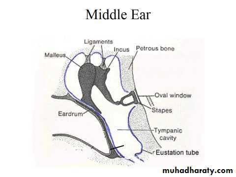 • The middle ear is a narrow air space compressed mediolaterally, occupying the petrous part of temporal bone. It contains a chain of three tiny auditory ossicles (malleus, incus and stapes) whose function is to transmit the vibrations of tympanic membrane to the perilymph of internal ear.