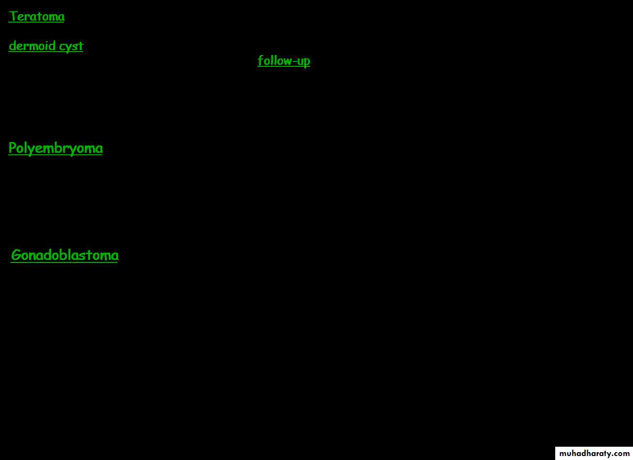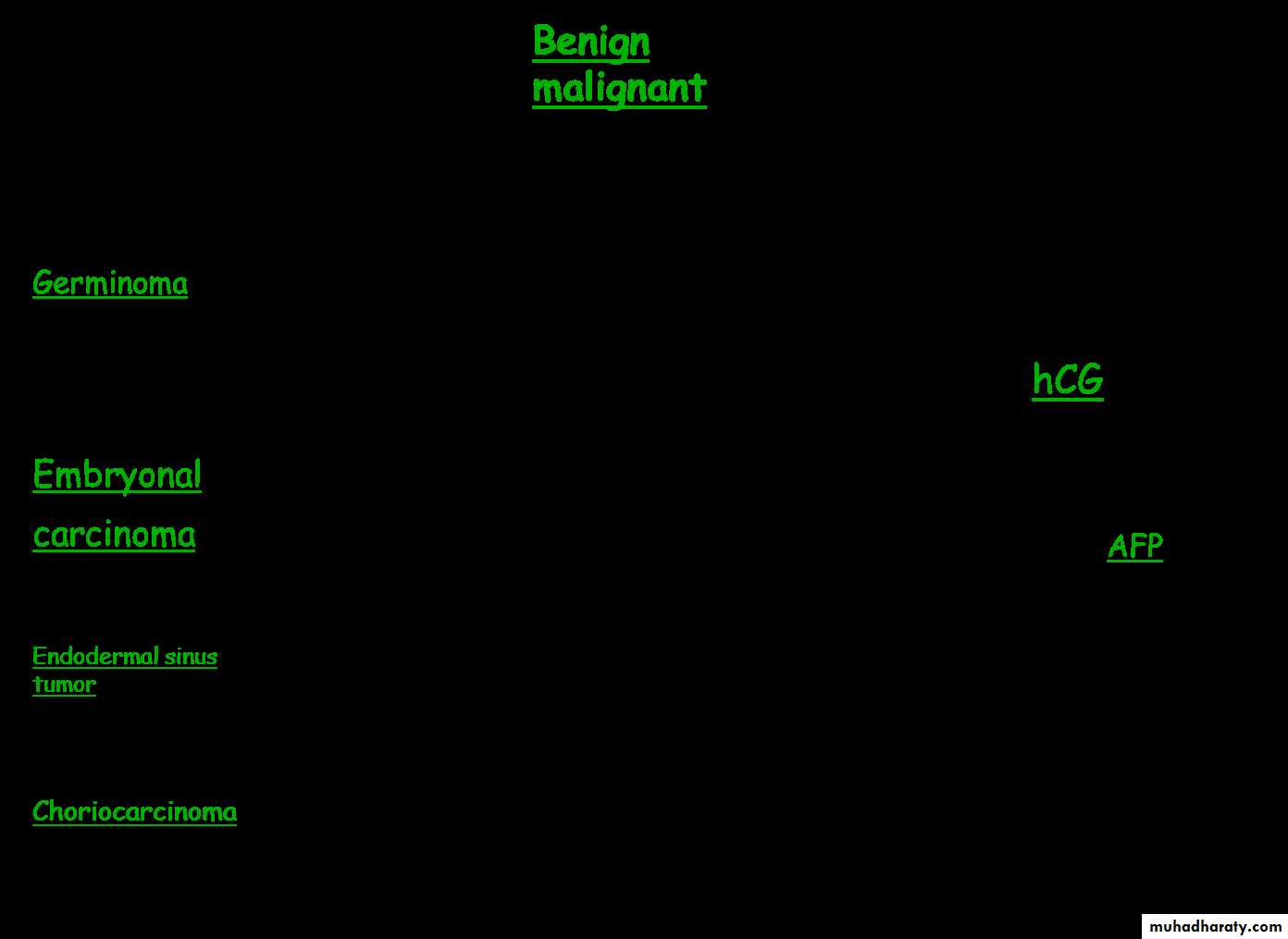 Infemales, germ cell tumors account for 30% of ovarian tumors, but only 1 to 3% ofovarian cancersinNorth America. Inyounger women germ cell tumors are more common, thus in patients under the ageof 21, 60% of ovarian tumors are of the germ cell type, and up to one-third aremalignant. Inmales, germ cell tumors of the testis occur typically after puberty and are malignant (testicular cancer). Inneonates, infants, andchildrenyounger than 4 years, the majority of germ cell tumors aresacrococcygealteratomas.