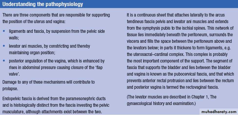 Damage to the major supports of the vagina, i.e. ligaments, fascia and levator ani muscles, leads to prolapse.