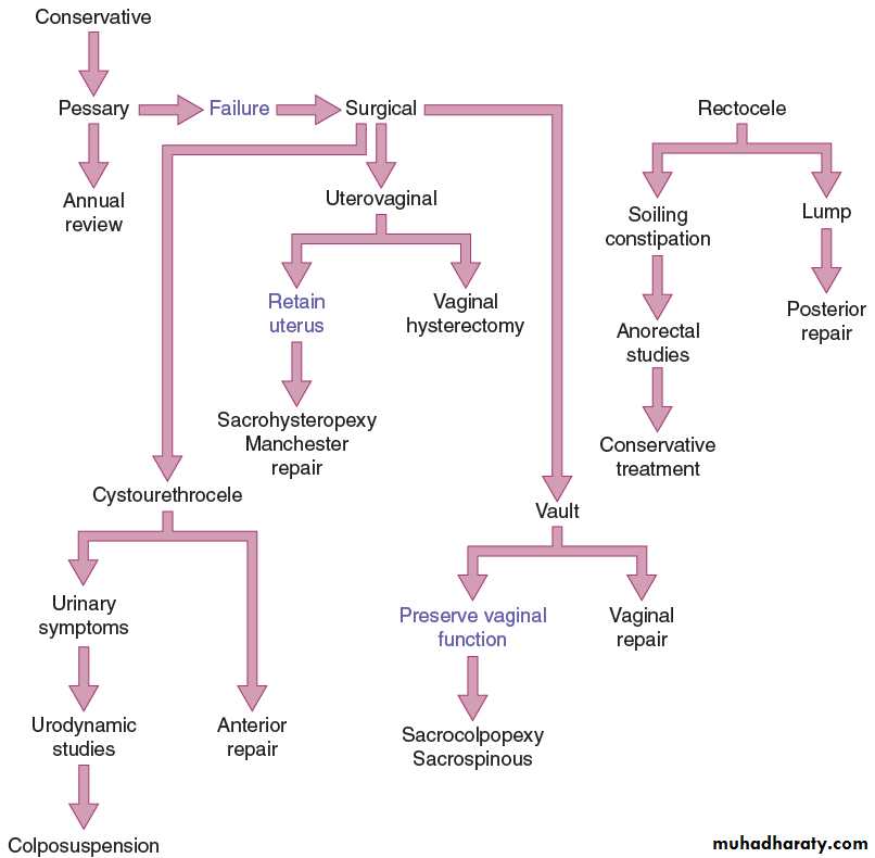 The choice of treatment depends on the patient’swishes, level of fitness and desire to preserve coitalfunction.Prior to specific treatment, attempts shouldbe made to correct obesity, chronic cough orconstipation. If the prolapse is ulcerated, a 7-daycourse of topical oestrogen should be administered.