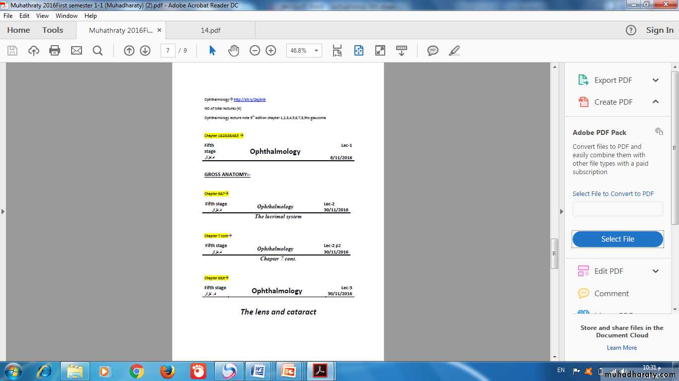 NO.of total lectures (4)Ophthalmology lecture note 9th edition chapter 1,2,3,4,5,6,7,8,9to glaucoma