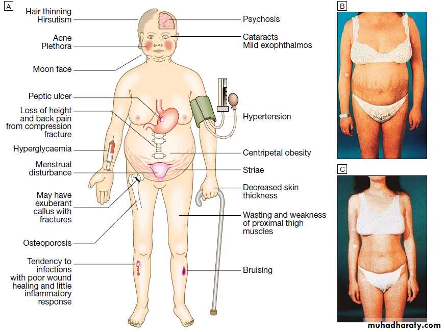 Very high cortisol levels overcome the barrier of 11β-HSD2 in the kidney and cause hypokalaemic alkalosis. Hypokalaemia aggravates both myopathy and hyperglycaemia (by inhibiting insulin secretion).