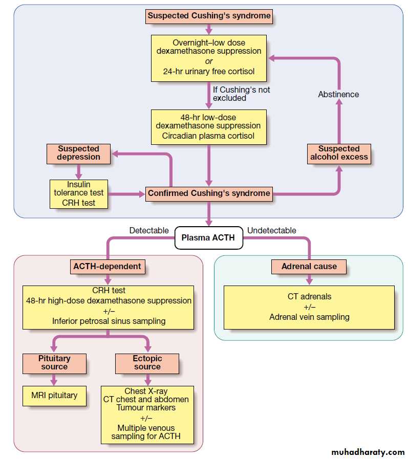 Inferior petrosal sinus sampling with measurement of ACTH may be helpful in confirming Cushing's disease if the MRI does not show a microadenoma. CT or MRI detects most adrenal tumours; adrenal carcinomas are usually large (> 5 cm) and have other features of malignancy