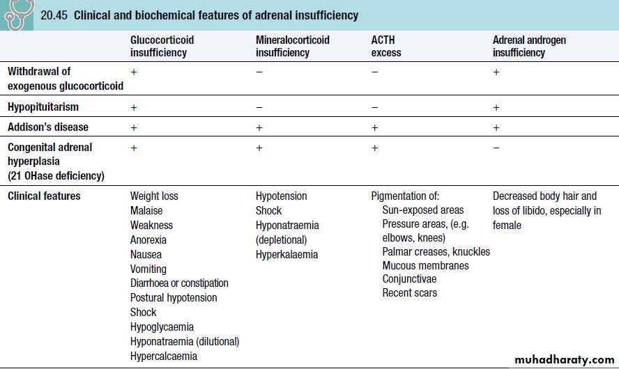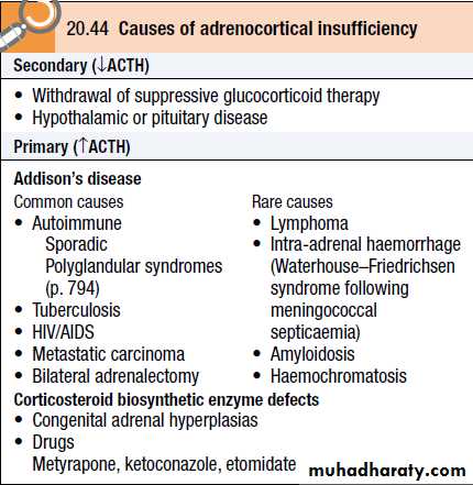 The most common is ACTH deficiency (secondary adrenocortical failure), usually because of inappropriate withdrawal of chronic glucocorticoid therapy or a pituitary tumour