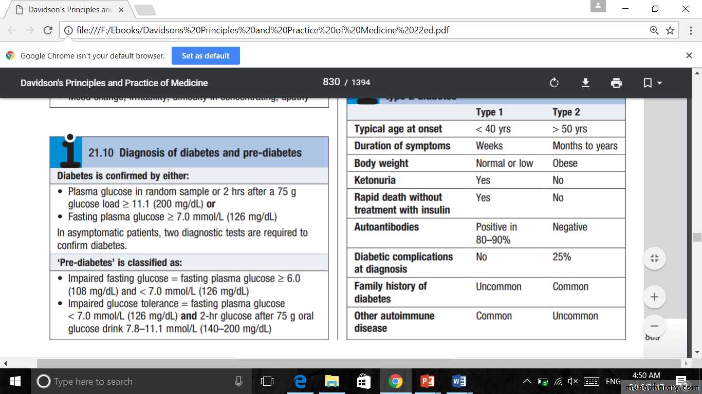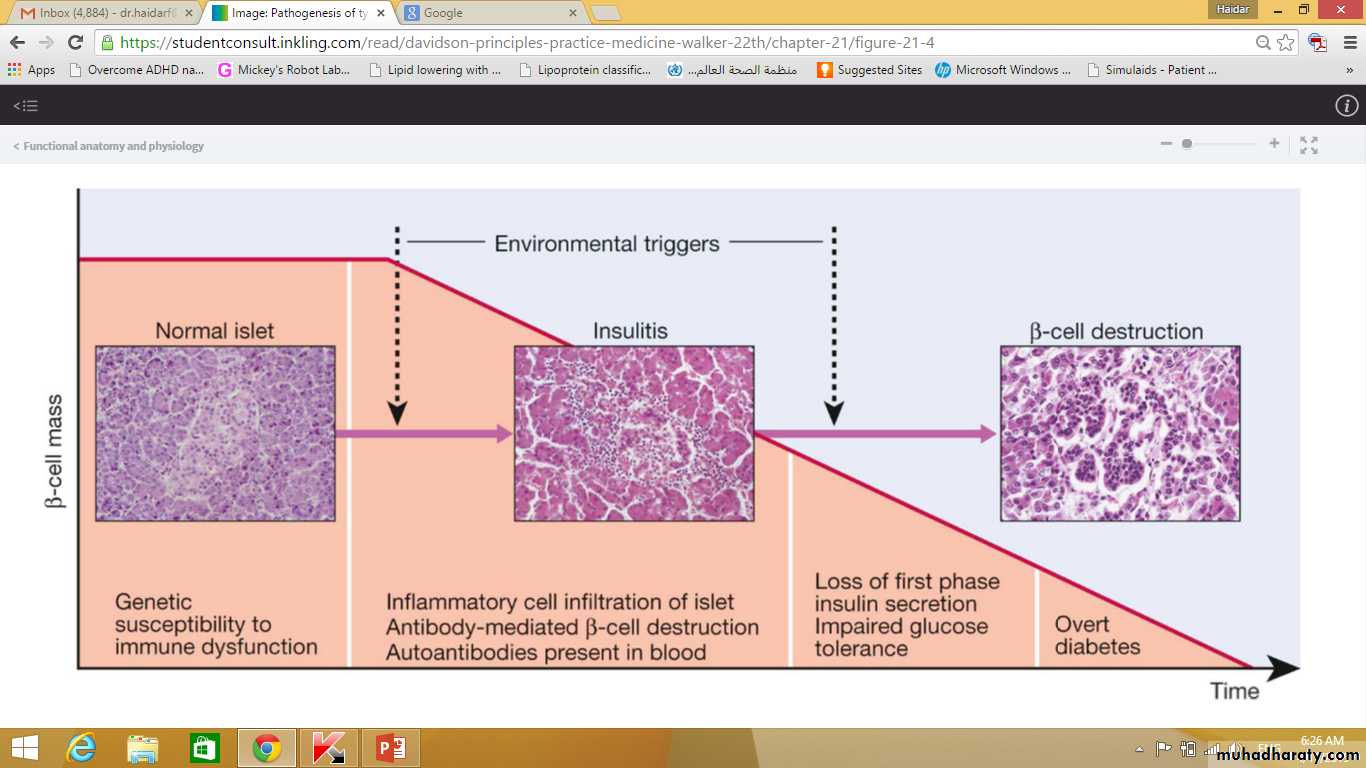Patients with type 1 diabetes present when progressive β-cell destruction has crossed a threshold at which adequate insulin secretion and normal blood glucose levels can no longer be sustained.Above a certain level, high glucose levels may be toxic to the remaining β cells, so that profound insulin deficiency rapidly ensues, causing the metabolic sequelae shown in figure in the next slide.