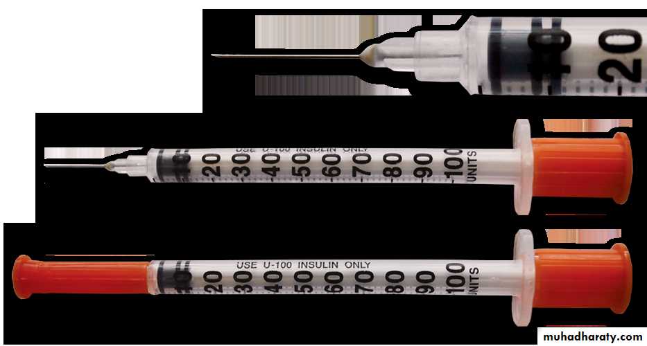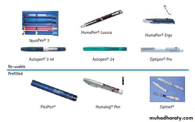 Insulin can be administered using a disposable plastic syringe with a fine needle (which can be re-used several times), but this has largely been replaced by pen injectors containing insulin in cartridges sufficient for multiple dosing. These are also available as pre-loaded disposable pens.