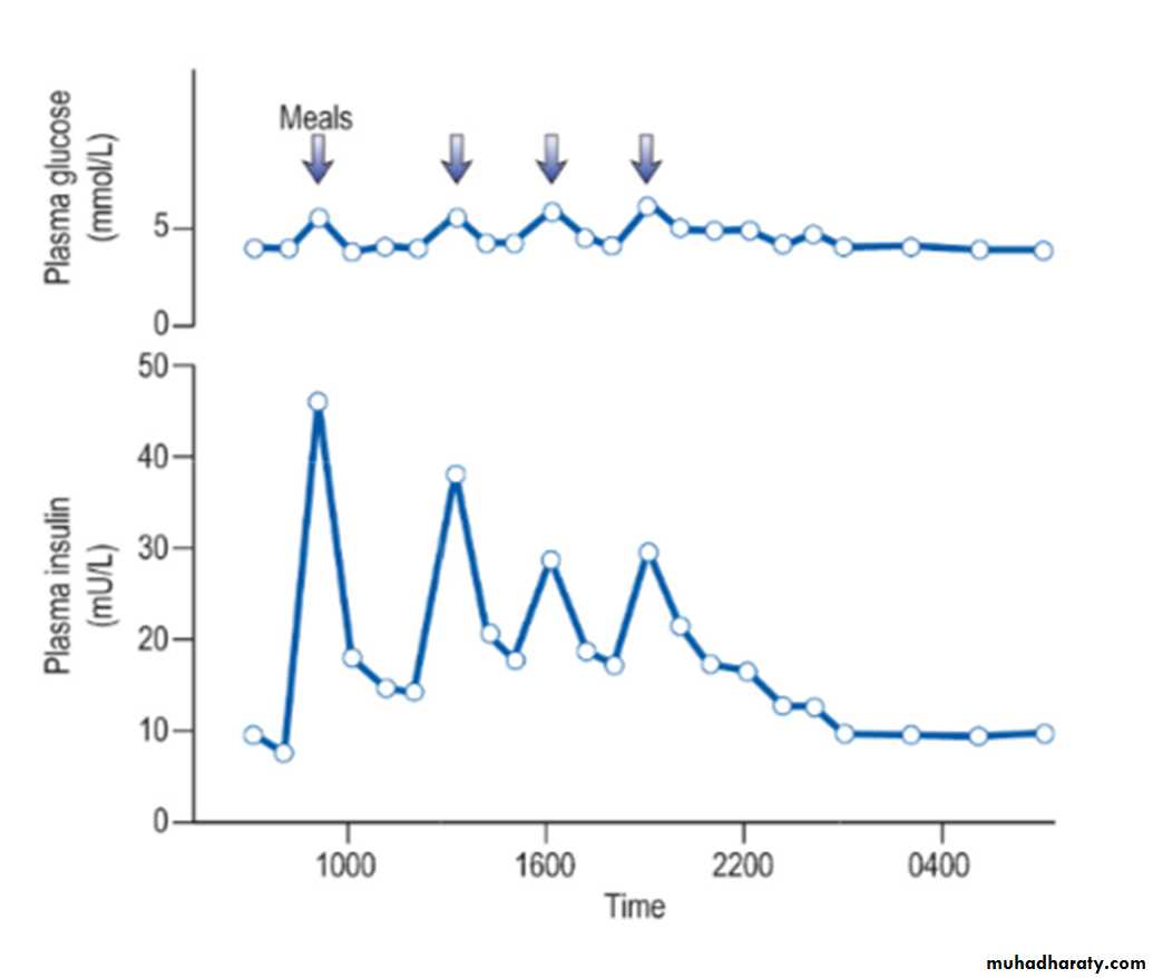 Insulin is found in every vertebrate and the key parts of the molecule show few species differences. Small differences in the amino acid sequence may alter the antigenicity of the molecule. The glucose and insulin profiles in normal subjects are shown in the figure:Short-acting insulins