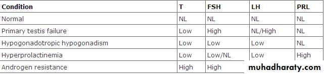 Less than 3% of infertile men have hormonal etiology.Used to evaluate the hypothalamo-pituitary-gonadal axis.