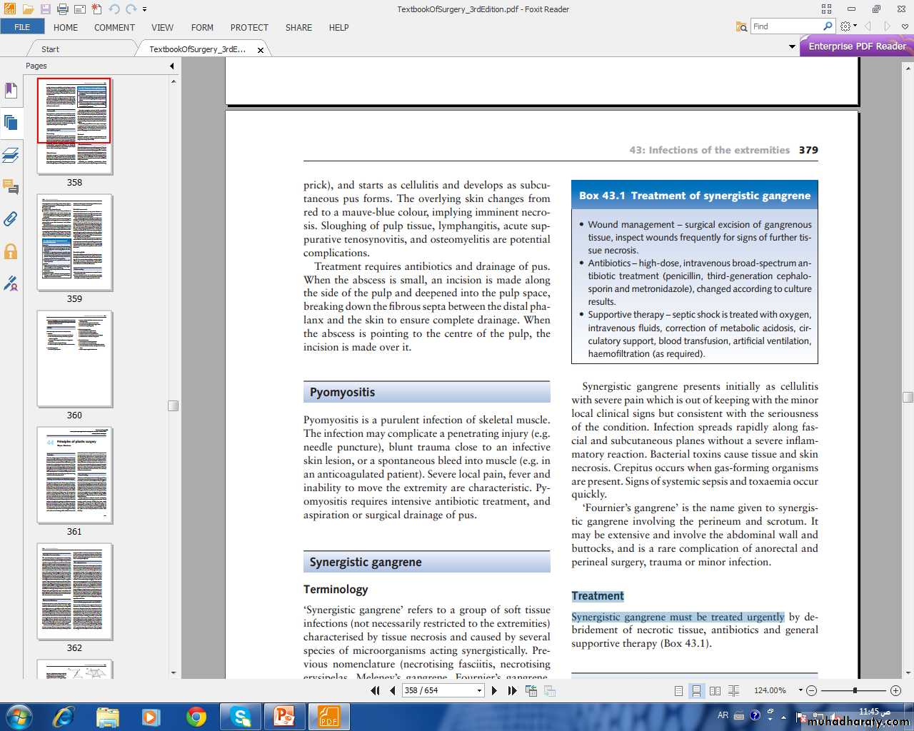 Cellulitis of an extremity is treated by elevation andimmobilisation with a splint or plaster ‘back slab’, andantibiotics. Penicillin (2 million units every 6 hours)or flucloxacillin (1–2 g every 6 hours) is given intravenouslyfor 3–5 days and then continued orallyfor a further 10 days. Blood levels of penicillin maybe increased by oral probenecid, which reduces renal