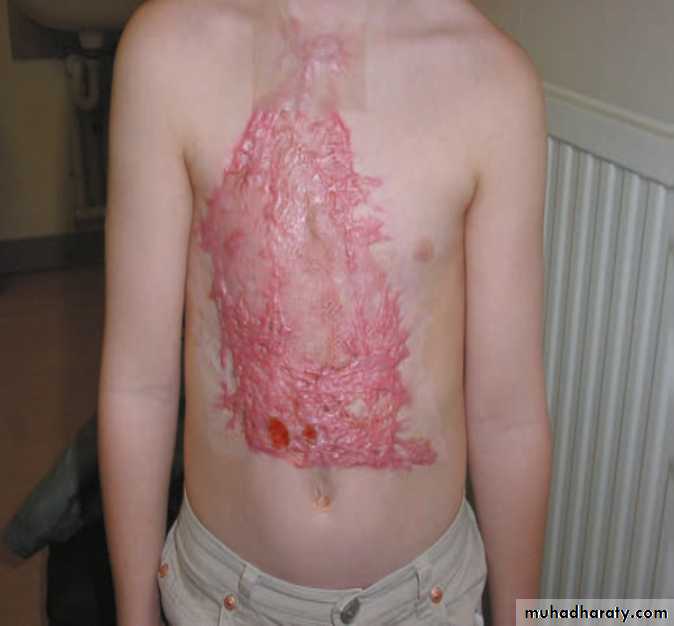 hyperpigmentation and sometimes complete loss of pigmentation (Leukoderma).Fibroplastic reaction is manifested producing excessive collagen fiber hypertrophic scar and may be keloid with partial or complete loss of skin elasticity.