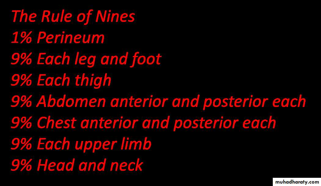 Due to that , we always estimate the surface area burnt as % of the body surface area. The most popular more accurate in adults and the simplest is The Rule of Nines .