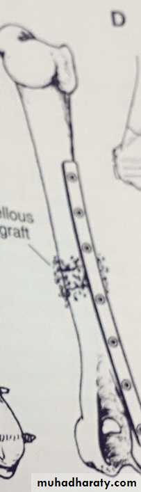 Rigid stabilization using a compression plate or external skeletal fixation to convert the fibrous union to osseous consolidation.Cancellous bone grafting.