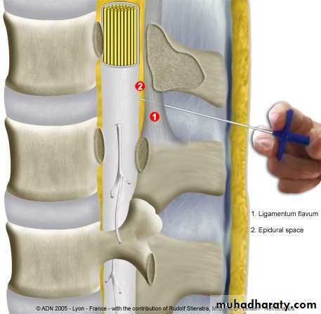 Epidural block: -Advantage: -1. Easier to gauge & limit the extend of the spread of an epidural block, because the content of the space is not liquid.2. Since dura is not punctured, the danger of meningitis, post anaesthesia headache & damage to the spinal cord are reduced.