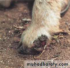 Scabby mouth sores on the legs are susceptible to fly strike. These leg lesions are most common in good seasons, when the legs are constantly exposed to long, wet pasture. The skin becomes macerated, and the virus then enters causing large scabby plaques. Leg and foot lesions may also occur when sheep graze stubble paddocks and the skin is damaged by the sharp stalks remaining after the crop has been harvested. Affected sheep may be protected against fly strike by walking them through a footbath of jetting solution. Sheep with scabs around the mouth should be supplied with soft, lush feed to allow easier grazing, and to reduce trauma to the scabs while they heal.